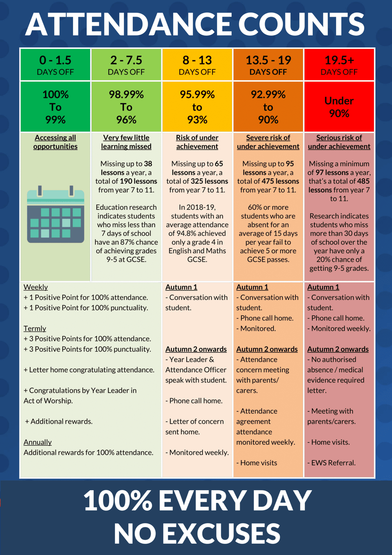 Parents have a legal responsibility to ensure their child attends the Academy regularly and arrives on time each day. We expect students’ attendance to be 98% or above and are always grateful for parental support, as only by working in partnership can we achieve this aim. We do appreciate that there may occasionally be good reason for absence but strongly believe that attendance has a direct link to achievement and so high records of attendance remain a priority at the Academy.